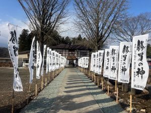 幟は浄書のうえ、ご神前にてお祓いをお受けし、現在は境内に掲げていただいております。